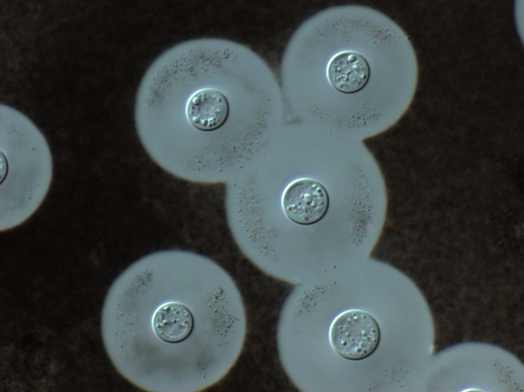 Figura 5. Fotografias de células do fungo Cryptococcus neoformans visto ao microscópio de luz. As células (círculos menores) são envoltas por uma estrutura chamada cápsula (círculos maiores). A foto à esquerda utiliza a técnica de microscopia de fluorescência, evidenciando a cápsula (verde) e a parede das células (azul). A foto à direita utiliza a técnica de coloração com tinta nanquim. O pigmento do nanquim se espalha ao redor do fungo. A cápsula dos fungos mede cerca de 0,001 cm, ou seja, muito pequena para ser vista a olho nu. Créditos: Fernanda Fonseca / CDTS / Fiocruz